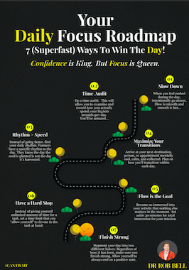 Download your complimentary copy of the Daily Focus Roadmap: 7 (Super fast) Ways To Win The Day!
